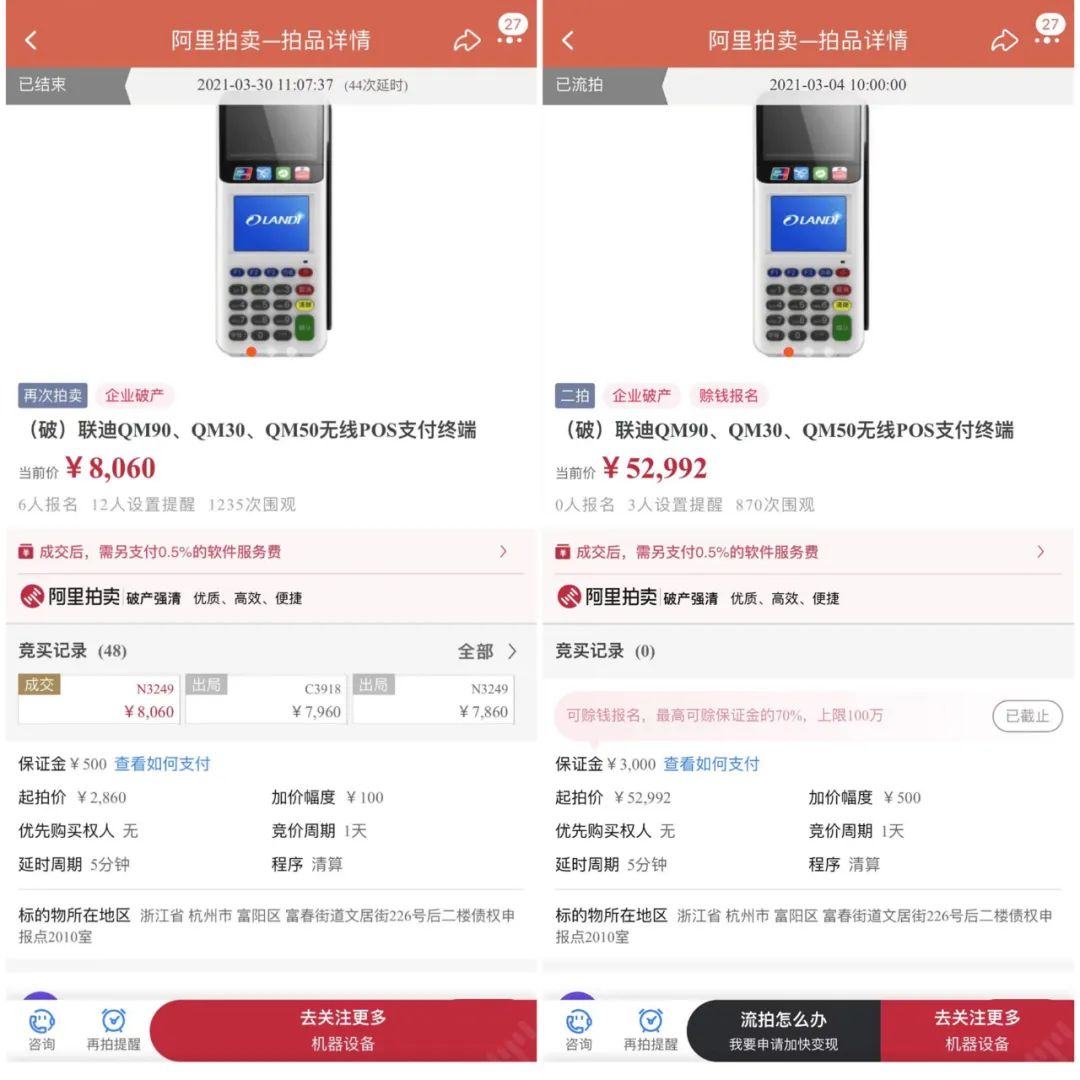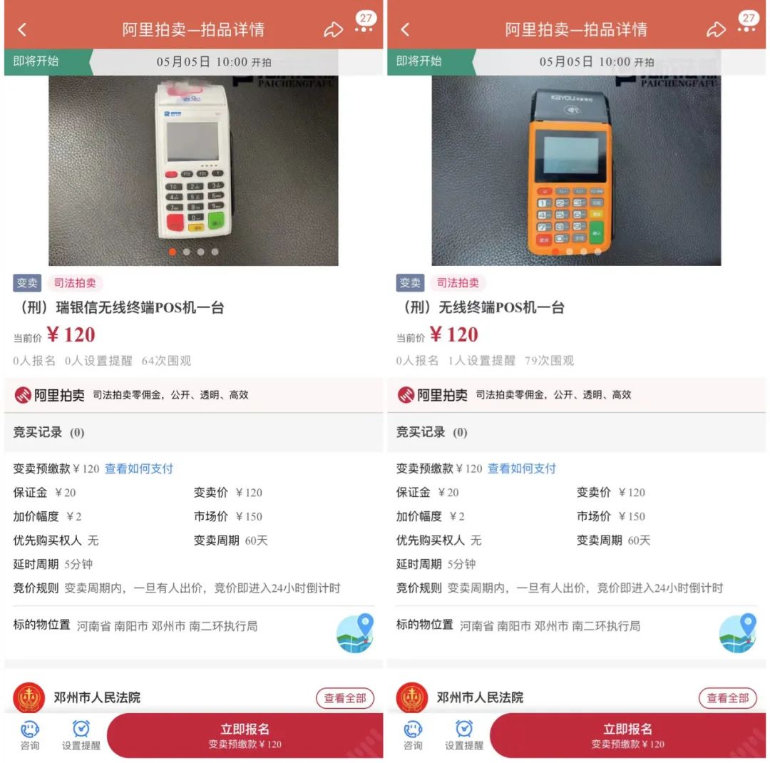 此外,小編還發(fā)現(xiàn)其中有部分拍品是剛上架,比如下圖的拉卡拉、卡友支付的2臺終端,起拍價為120元,有多人次圍觀。小編發(fā)現(xiàn)該拍品此前拍賣價格是150元,流拍后又降低了30元繼續(xù)拍賣的,感覺還得第三次,不然120元買來干嘛?