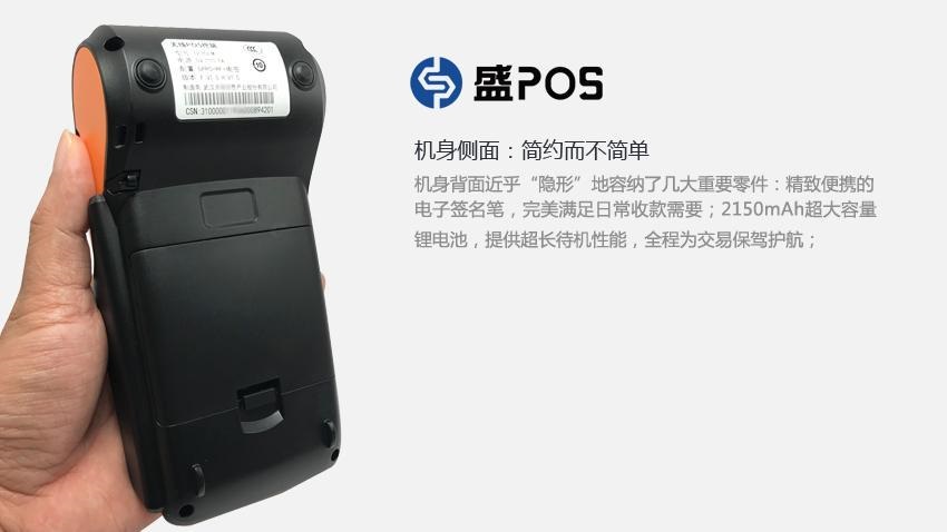 機身背面近乎“隱形”地容納了幾大重要零件:精致便攜的電子簽名筆,完美滿足日常收款需要;2150mAh超大容量鋰電池,提供超長待機性能,全程為交易保駕護航;雙卡槽待機,提供強大的GPRS無線通訊,讓用戶暢享安全、可靠、便捷的支付體驗。